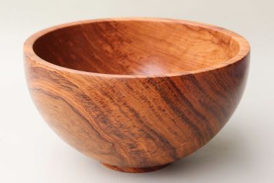 A plain bowl with undercut rim turned from Tasmanian Blackwood, with a wax finish. Five branches converged into what was the centre of the bowl, creating an interesting turning experience and some stunning grain patterns. Size: 215mm x 90mm