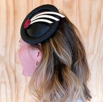 This Flight of Fancy Fascinator is designed to be worn. It is very light and measures 140mm diameter made from Kauri and Jacaranda with pyrography and painted Satin Black, The Button is Camphor painted red and adorned with natural Kahikatea shafts. The stand is made from Rosewood finished with sanding seal and beall buffed.