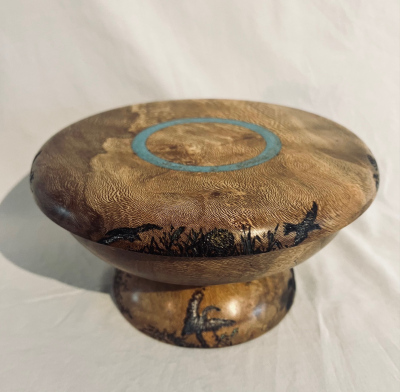 A cake-stand of figured London plane finished with Aussie oil, embellished using pyrography, a dremel tool and iridescent paints. 11cm high x 20 cm diameter, it is decorated with New Zealand birds and a circle of crushed turquoise on top.